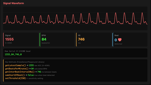 See your heartbeat instantly — no software to install. Our WebSerial Dashboard connects directly to your PulseSensor through Chrome. Just plug in, click connect, and watch your pulse waveform and BPM in real-time. Perfect for testing your sensor or demoing to friends.
